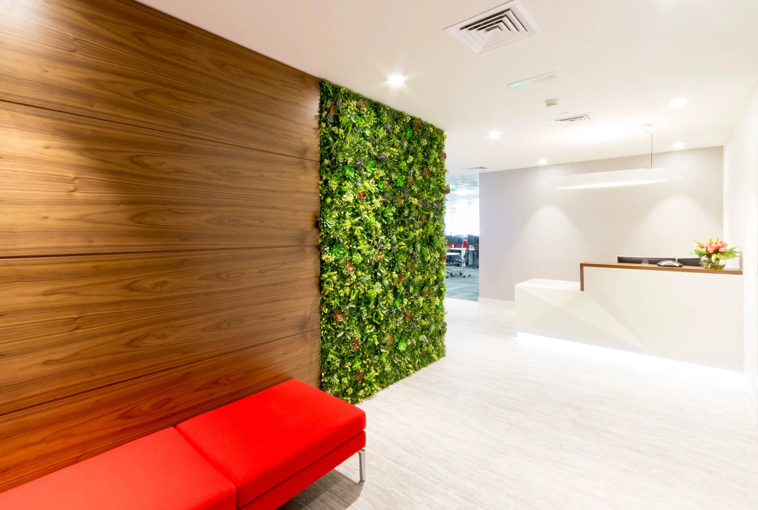 Custom-designed millwork including reception desk, conference room bench seating and biophilic wall