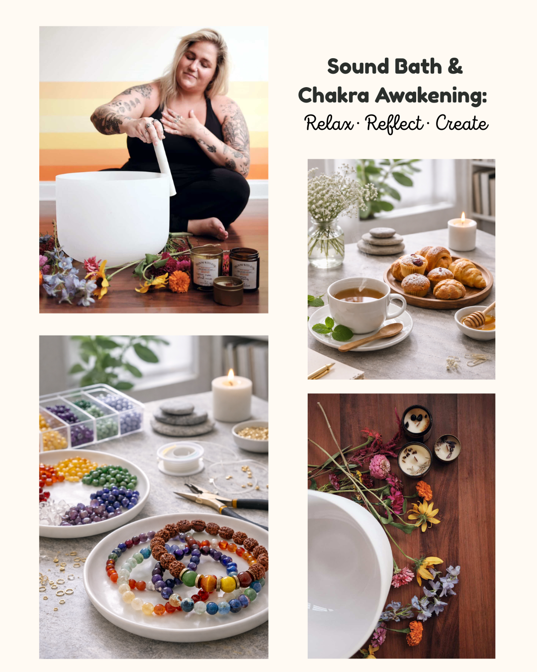 We’ll begin with tea and small bites, followed by a grounding sound bath by Bloom with Sam. From there, we’ll explore the seven chakras: where they are located in the body, their associated colors, and what each represents.